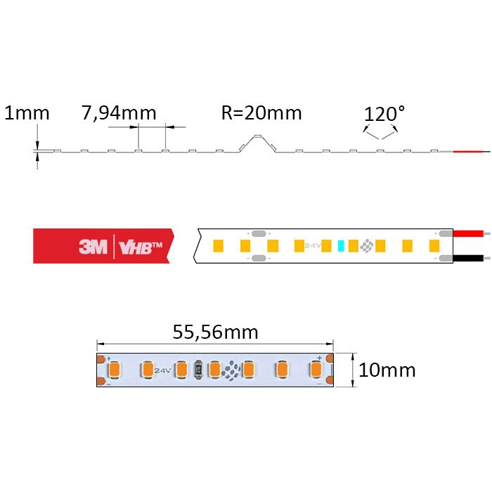 - SMD2835 (Surface-Mounted Device) technologie - se vyznačuje vysokou efektivitou a účinností s přihlédnutím na dobré pasivní chlazení. Diody jsou namontovány na hliníkové chladící podložce. Tento aspekt prodlužuje životnost a umožňuje pro LED pásek SMD2835 24V dosahovat vysoké svítivosti a účinnosti s vyzařovacím úhlem 120°.