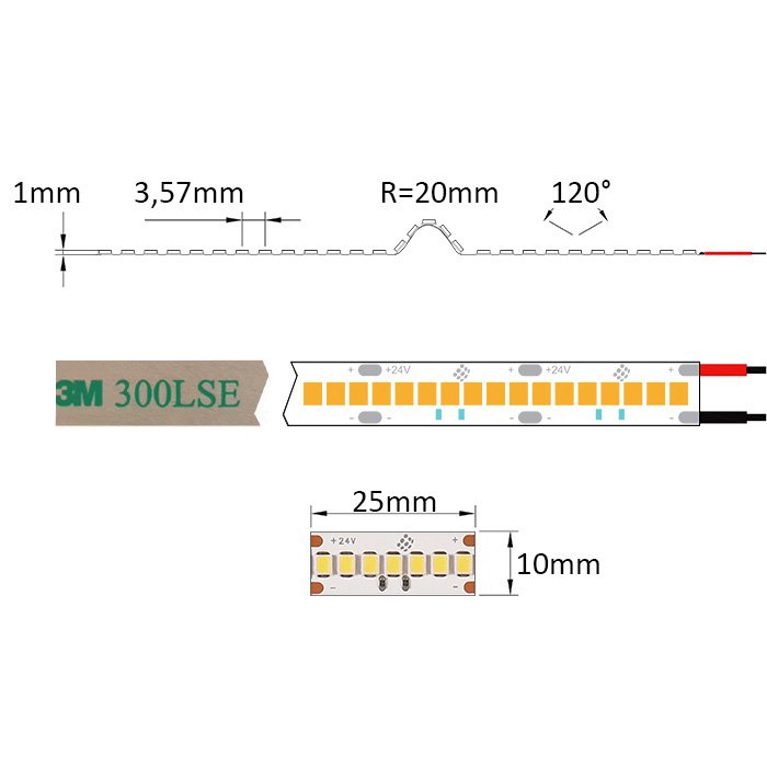 - SMD2835 (Surface-Mounted Device) technologie - se vyznačuje vysokou efektivitou a účinností s přihlédnutím na dobré pasivní chlazení. Diody jsou namontovány na hliníkové chladící podložce. Tento aspekt prodlužuje životnost a umožňuje pro LED pásek SMD2835 24V dosahovat vysoké svítivosti a účinnosti s vyzařovacím úhlem 120°.