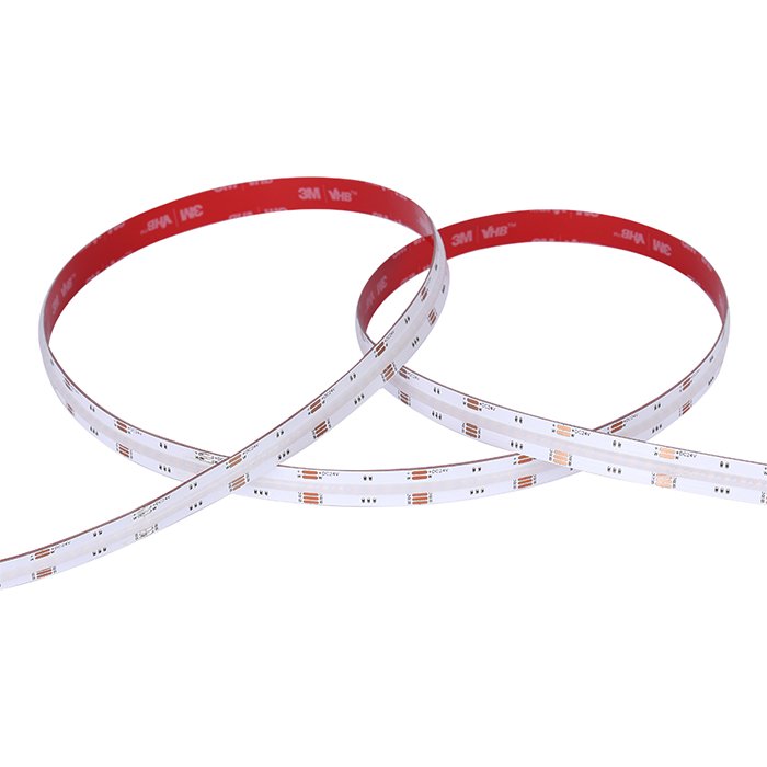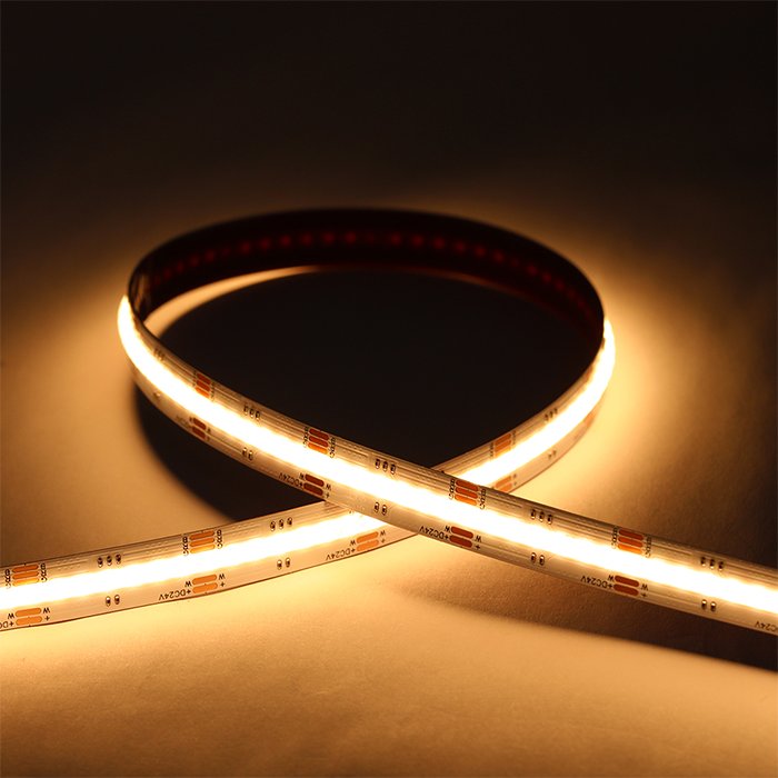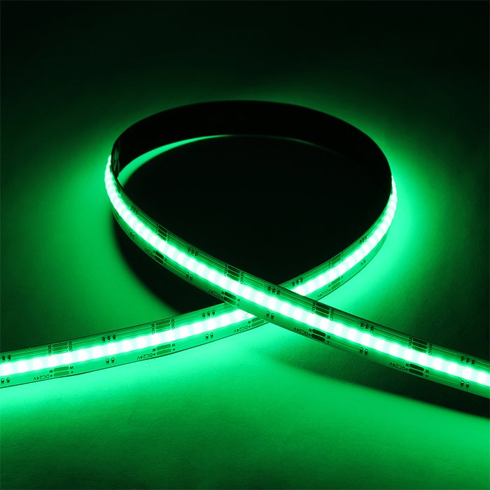 RGBW COB LED pásek 24V s produktovým označením COB-RGBW24896 je výrobkem špičkových světelných parametrů. Výhodou technologie RGBW (Red, Green, Blue, White) je možnost vytvářet široké spektrum barev včetně zapojení čisté bílé složky světla. Zahrnutí bílé složky světla do RGB spektra pomáhá dosáhnout lepší barevnou přesnost a konzistenci. Samozřejmostí je možnost spektrum RGB ztlumit nebo zcela vypnout a použít k osvětlení pouze zvolenou bílou složku světla. COB (Chip On Board) provedení je charakteristické umístěním velkého množství LED čipů těsně vedle sebe s cílem dosáhnout jednolité souvislé světelné linie. Rovnoměrný světelný tok bez viditelných bodů světla je významnou výhodou tohoto výrobku. Od prvotního technického návrhu až po koncovou výrobu byl kladen důraz na to, aby jeho účinnost (lm/W), produktové zpracování a design splňovaly odpovídající kvalitativní standardy. Společně s dalšími komponenty slouží 24V COB RGBW pásek pro malosériovou a individuální výrobu svítidel.