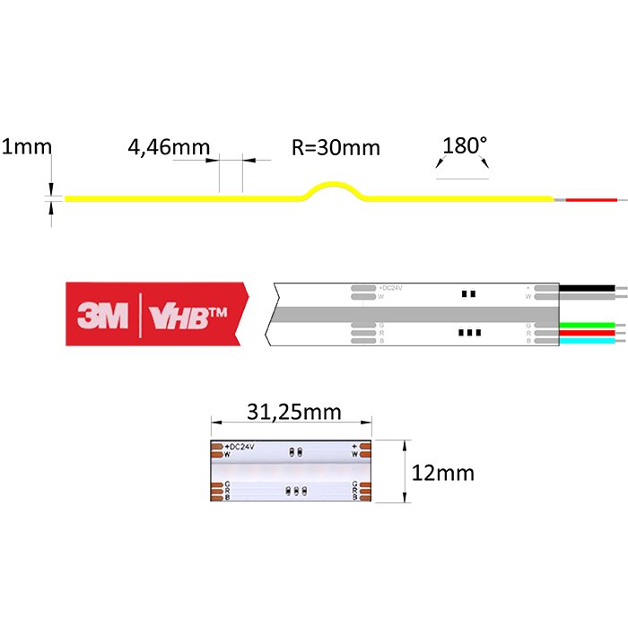 Základní technické vlastnosti pro 24V RGBW COB LED pásek COB-RGBW24896