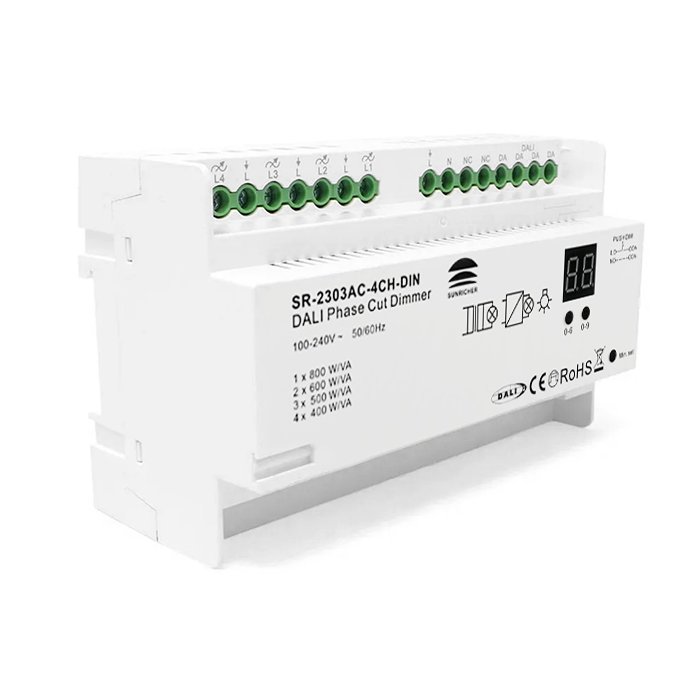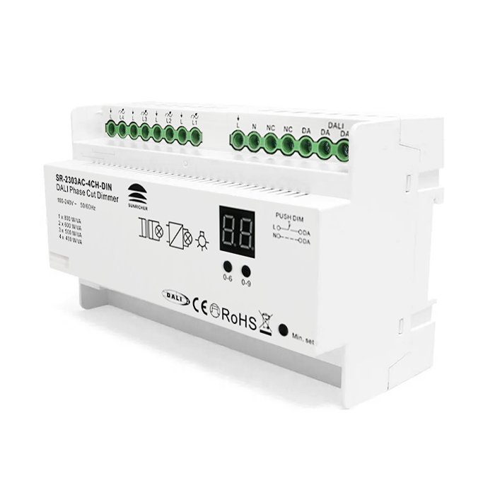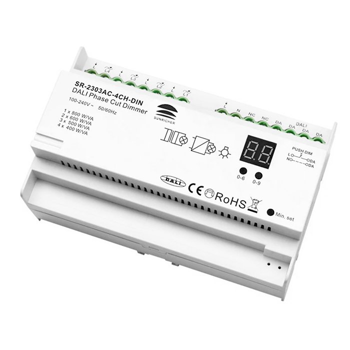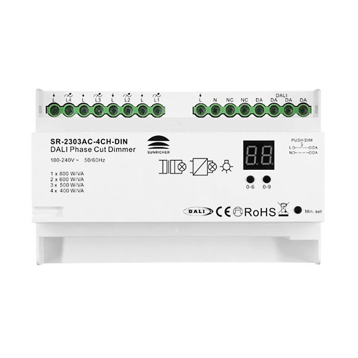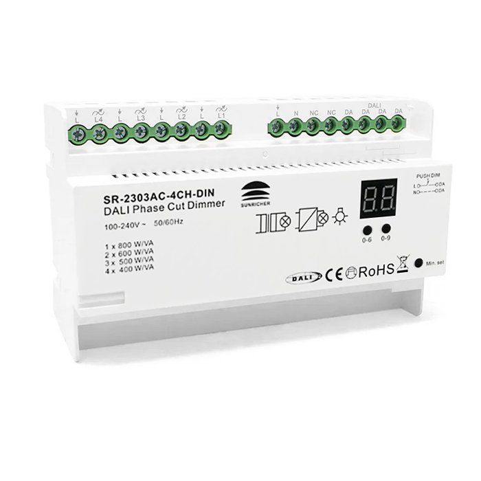 Čtyř kanálový DALI stmívač osvětlení 230V s montáží na DIN lištu do elektrického rozvaděče a označením 2303AC-4CH-DIN je špičkový elektronický produkt určený pro stmívaní osvětlení, LED žárovek a dalších zařízení pomocí DALI protokolu. Umožňuje integraci do systémů automatizace budov pomocí DALI protokolu s možností spínání jednoho až čtyř kanálů. DALI stmívač 230V 2303AC-4CH-DIN podporuje stmívání Trailing Edge Dimming (stmívání sestupné hrany). Moderní funkce a pokročilá elektronika navíc umožňují nastavení minimálního jasu osvětlení.