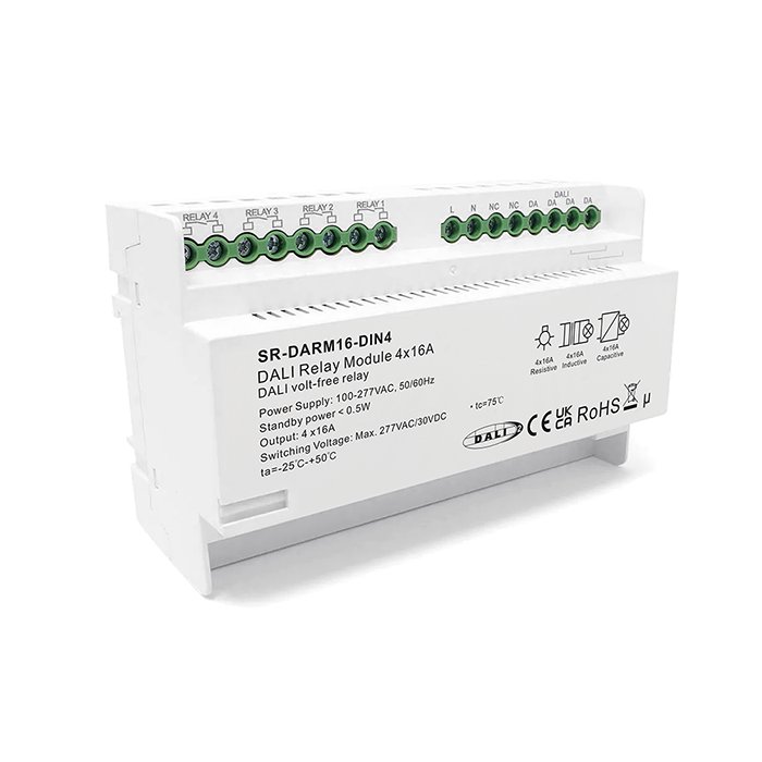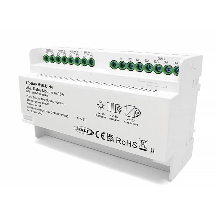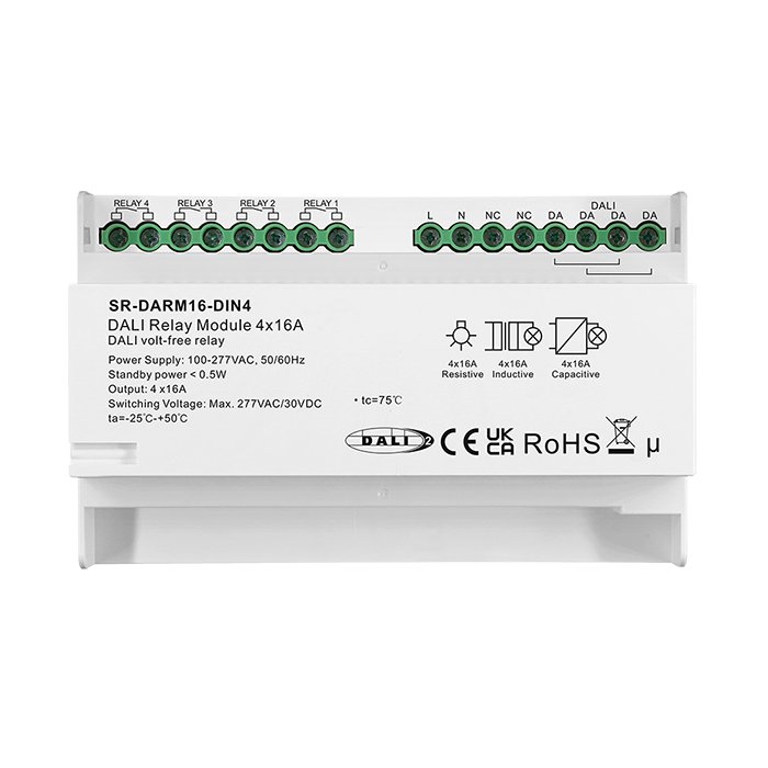 Čtyř kanálový DALI spínač 230V s montáží na DIN lištu do elektrického rozvaděče a označením DARM16-DIN4 je elektronický produkt určený pro spínání osvětlení, LED žárovek a dalších elektronických zařízení pomocí DALI protokolu. DALI spínač má čtyři relé kontakty, které lze ovládat samostatně pomocí DALI adres. To znamená, že můžete nezávisle zapínat a vypínat čtyři různá zařízení.