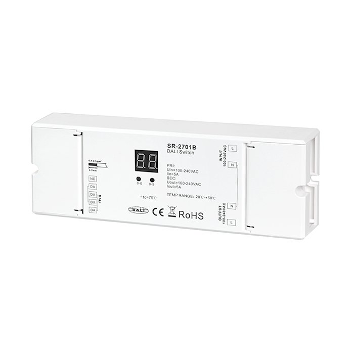 DALI spínač 230V s označením SR-2701B je elektronický produkt určený pro spínání osvětlení, LED žárovek a dalších elektronických zařízení pomocí DALI protokolu. Jeho výhodou je také jeho miniaturní velikost s možností montáže do podomítkové elektroinstalační krabičky KU68.