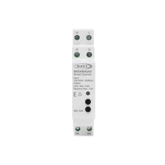 DALI stmívač osvětlení 230V na DIN lištu s označením DA9042A-D je špičkový elektronický produkt určený pro stmívaní osvětlení, LED žárovek a dalších zařízení pomocí DALI protokolu. Umožňuje připojení běžně dostupných tlačítkových vypínačů pomocí PUSH-DIM sběrnice nebo integraci do systémů automatizace budov pomocí DALI protokolu za účelem precizního a plynulého stmívání LED svítidel, žárovek a dalších zařízení. DALI stmívač 230V DA9042A-D podporuje stmívání Trailing Edge Dimming (stmívání sestupné hrany). Moderní funkce a pokročilá elektronika navíc umožňují nastavení minimálního jasu osvětlení a plynulé mikroprocesorové řízení stmívání.