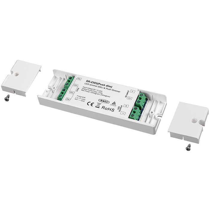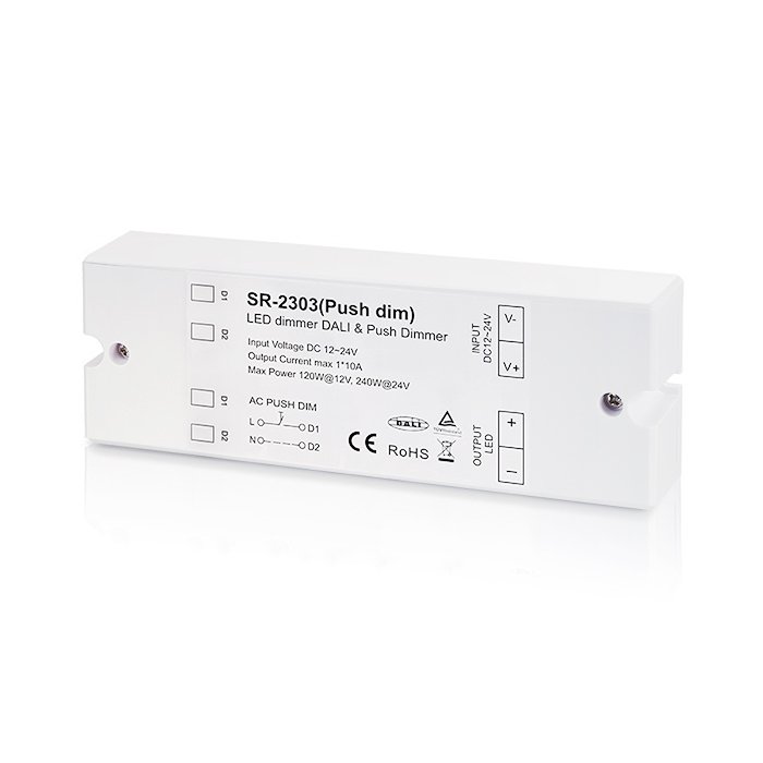 DALI stmívač s označením SR-2303-PUSH DIM je ideální řešení pro moderní a efektivní řízení osvětlení jednobarevných LED pásků pomocí DALI protokolu. Umožňuje připojení běžně dostupných tlačítkových vypínačů pomocí PUSH-DIM sběrnice nebo integraci do systémů automatizace budov pomocí DALI protokolu za účelem precizního a plynulé stmívání jednobarevných LED pásků: