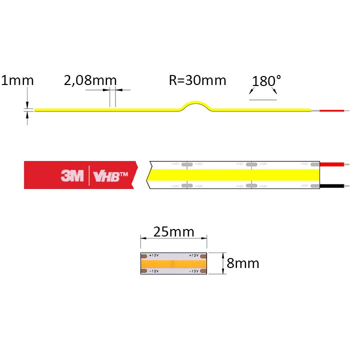 Bílá COB LED páska 12V COB-SC12480 je na své spodní straně opatřena speciální oboustrannou lepenkou 3M VHB. Tato samolepící páska slouží k montáži na zvolený podklad (důrazně doporučujeme využít LED profilové lišty z důvodu chlazení a ochrany LED pásku). Ten musí být hladký a odmaštěný. Připojení LED pásku k napájecímu napětí doporučujeme provést pájením.