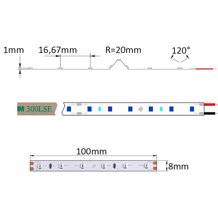 - 60 LED /1m počet LED diod na 1 běžný metr - vysoká hustota LED diod má pozitivní vliv na dosažení souvislé světelné linie při výrobě osvětlení.