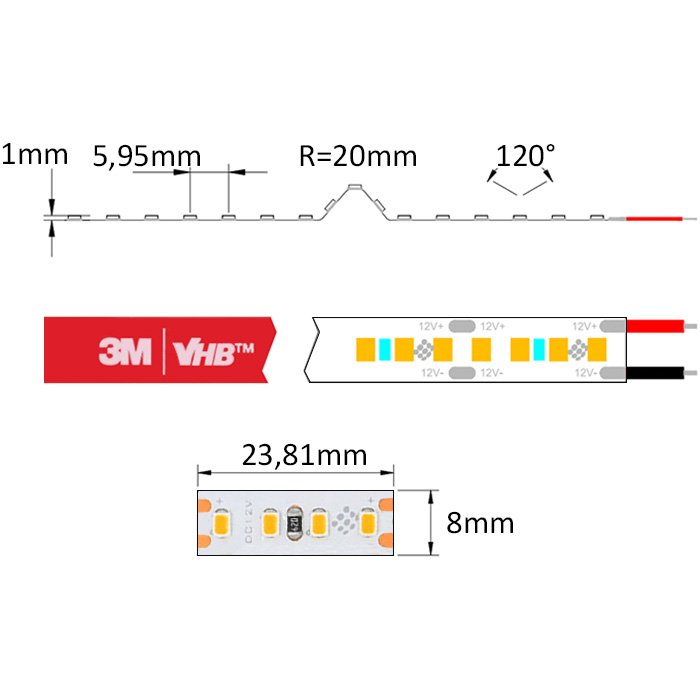 - SMD2835 (Surface-Mounted Device) technologie - se vyznačuje vysokou efektivitou a účinností s přihlédnutím na dobré pasivní chlazení. Diody jsou namontovány na hliníkové chladící podložce. Tento aspekt prodlužuje životnost a umožňuje pro LED pásek SMD2835 12V dosahovat vysoké svítivosti a účinnosti s vyzařovacím úhlem 120°.