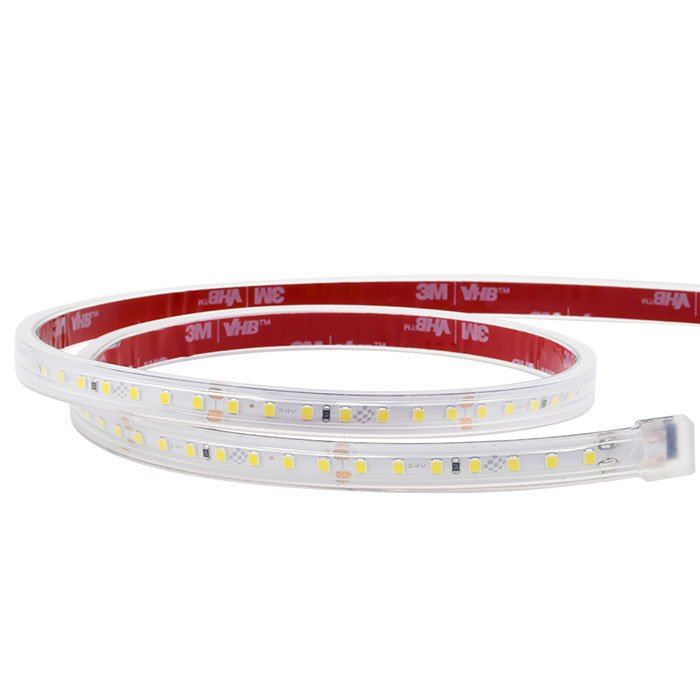 Důkladně byl vybrán i podkladový materiál a struktura. 24V LED pásek IP67 s označením SC24126 je postaven na tištěném spoji PCB (Printed Circuit Board) s celkovou šířkou 10mm (včetně transparentního pouzdra), dělitelností každých 5,5cm a podílem mědi 3OZ. Vysoký podíl mědi 3OZ při výrobě zajišťuje pro LED pásek 24V: