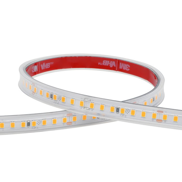 Venkovní LED pásek 24V splňuje třídu krytí IP67. Je osazen značkovými čipy Sanan v počtu 168 LED /1m s věrností podání barev CRI90+ (Color Rendering Index). Efektivitu a svítivost zajišťuje vysoký světelný tok s rozsahem barevných teplot: