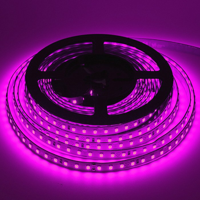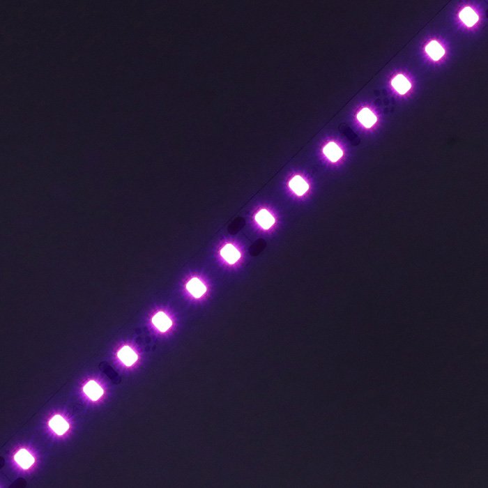 - SMD2835 (Surface-Mounted Device) technologie - se vyznačuje vysokou efektivitou a účinností s přihlédnutím na dobré pasivní chlazení. Diody jsou namontovány na hliníkové chladící podložce. Tento aspekt prodlužuje životnost a umožňuje pro fialový LED pásek SMD2835 24V dosahovat vysoké svítivosti a účinnosti s vyzařovacím úhlem 120°.