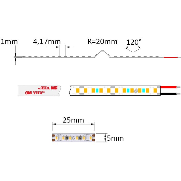 Bílá MINI LED páska 24V SC24240 je na své spodní straně opatřena speciální oboustrannou lepenkou 3M VHB. Tato samolepící páska slouží k montáži na zvolený podklad (důrazně doporučujeme využít LED profilové lišty z důvodu chlazení a ochrany SLIM LED pásku). Ten musí být hladký a odmaštěný. Připojení LED pásku k napájecímu napětí doporučujeme provést pájením.