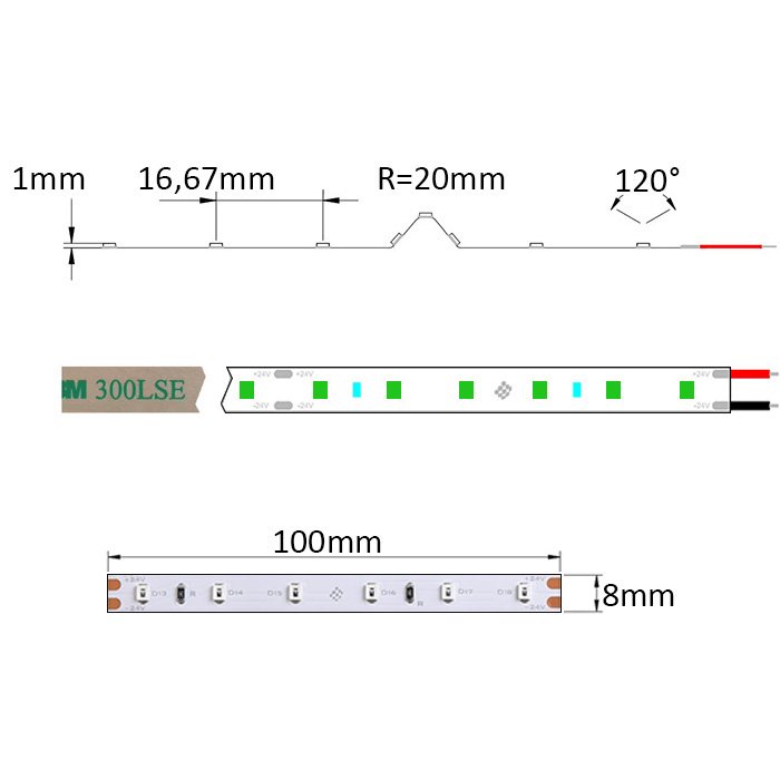 - 60 LED /1m počet LED diod na 1 běžný metr - vysoká hustota LED diod má pozitivní vliv na dosažení souvislé světelné linie při výrobě osvětlení.