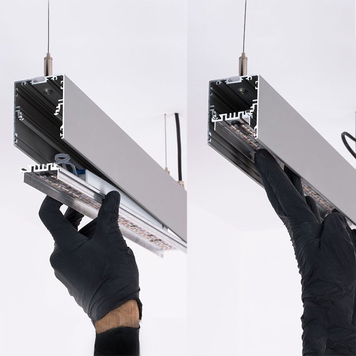 - Spojení osvětlovací LED profilu s montážní částí přináší profesionální řešení. Umožňuje oddělit osvětlovací část od montážního profilu a následně ji snadno opět vrátit zpět.