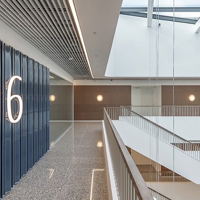 - Stropní lineární osvětlení s nepřímím osvětlením stropu - ve formě svěšeného výkonného svítidla s dvěma směry osvětlení.