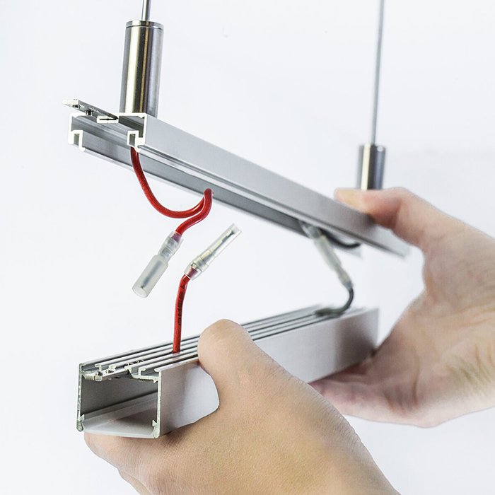 - Zavěšení a svěšení ze stropu v horizontálním směru - závěsný LED profil je možné svěsit a napájet (DC 12V/24V) pomocí speciálního montážního příslušenství - ocelového lanka nebo nerezového/hliníkového kovového prutu.