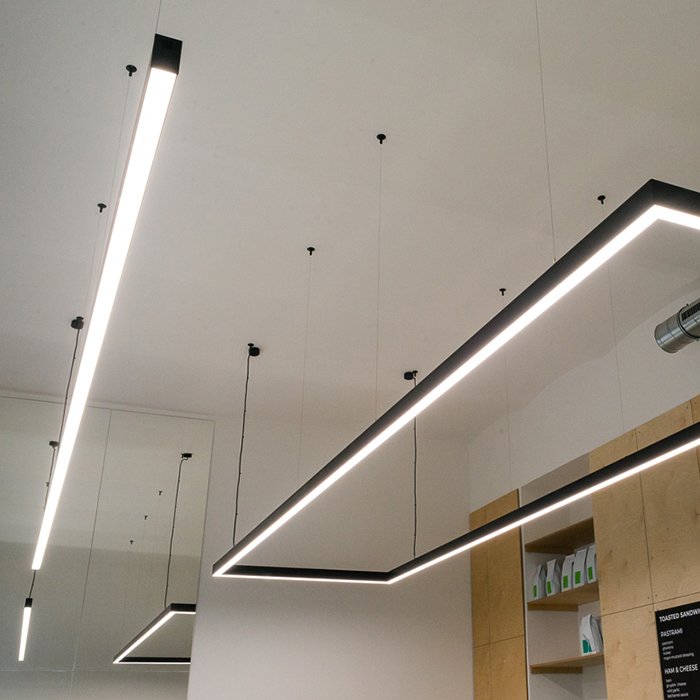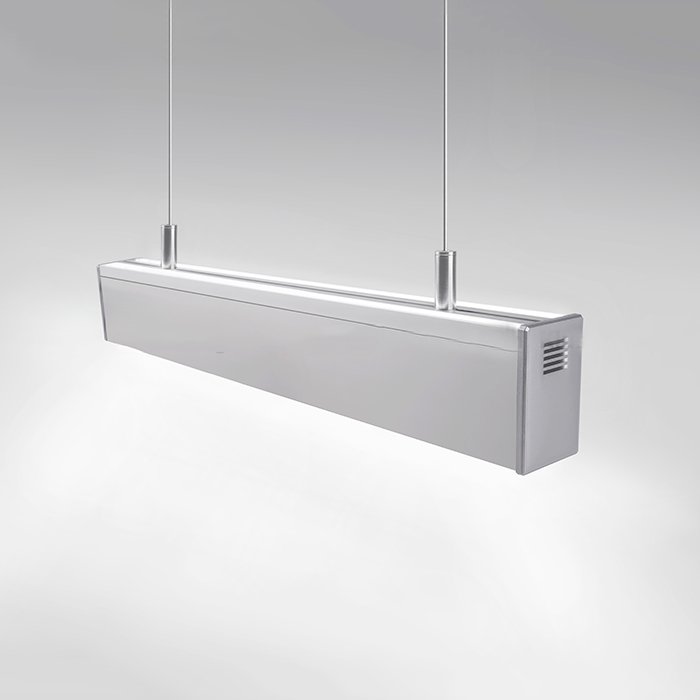 - Stropní lineární osvětlení s nepřímím osvětlením stropu - ve formě svěšeného výkonného svítidla s dvěma směry osvětlení.
