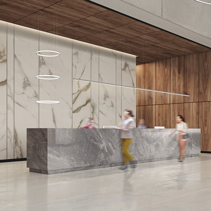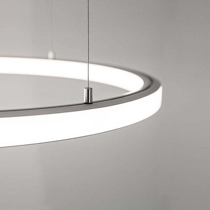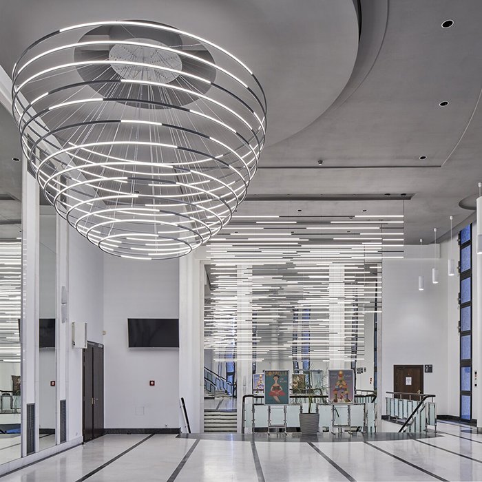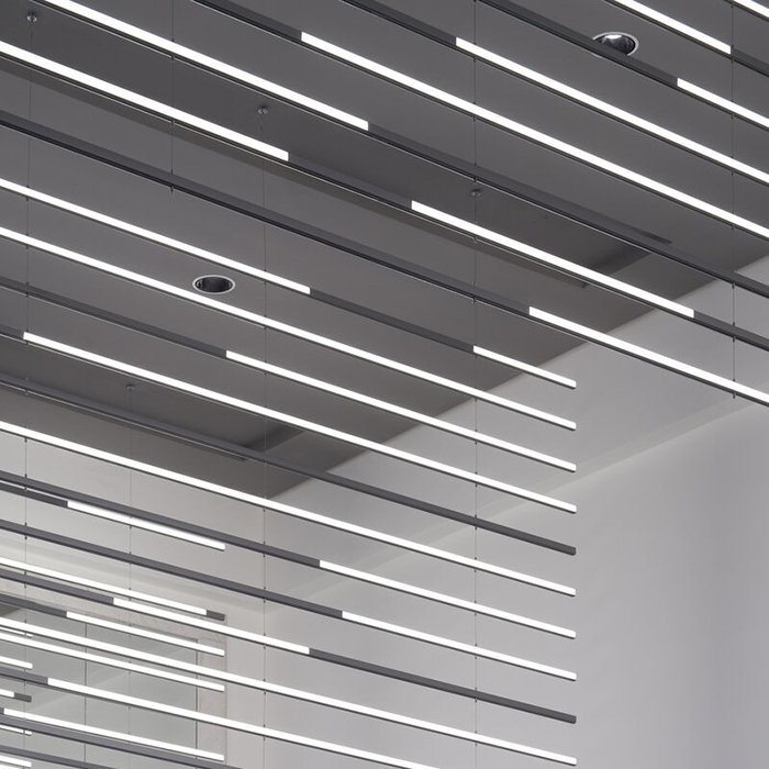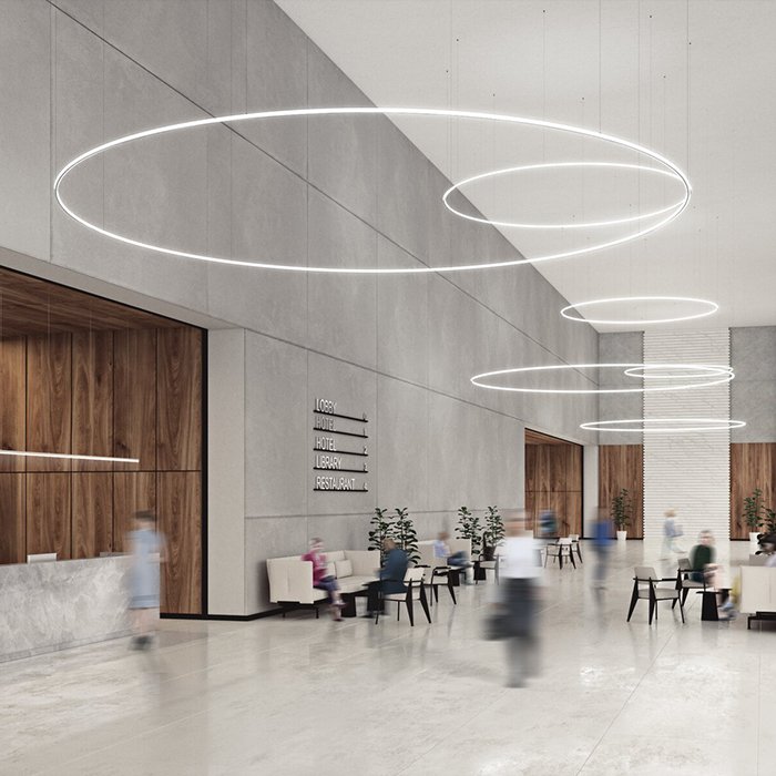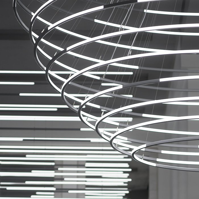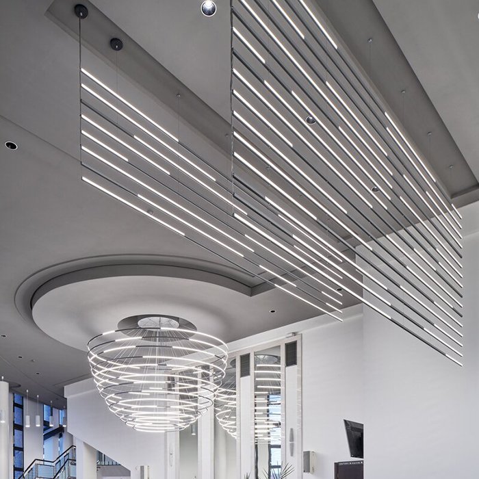 - Stropní lineární nebo kruhové osvětlení - ve formě svěšeného minimalistického svítidla s dvěma směry svícení.