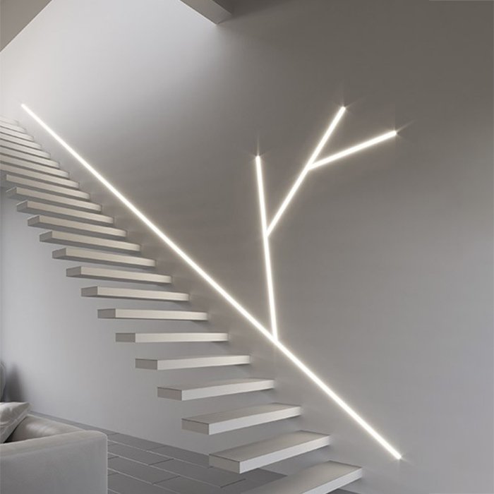- Lineární osvětlení v sádrokartonovém podhledu s možností plynulého přechodu do volného prostoru - osvětlení sádrokartonových podhledů a prostor formou liniového světla polygonálních tvarů.