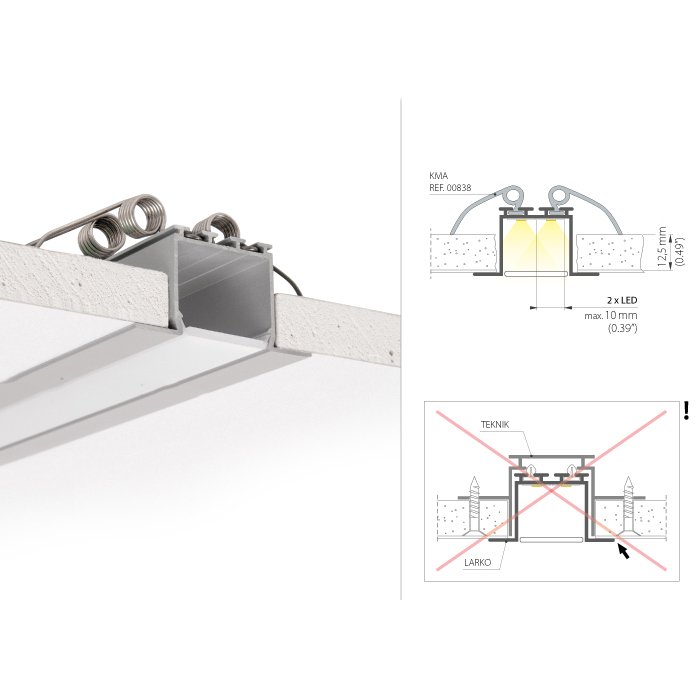 - Montáž 2x LED pásku o šířce max. 12mm | Pro souvislou světelnou linii bez viditelného bodování diod LED pásku doporučujeme >96 LED/1 běžný metr (tento parametr ovlivňuje výběr kompatibilního difuzoru).