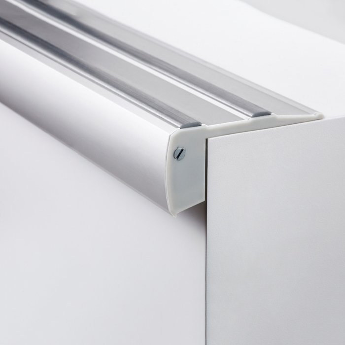 - Montáž profilu na schod pomocí vhodně zvolených vrutů pro daný typ podkladu. Montážní kotvící šrouby lze skrýt pod protiskluzovou gumu.