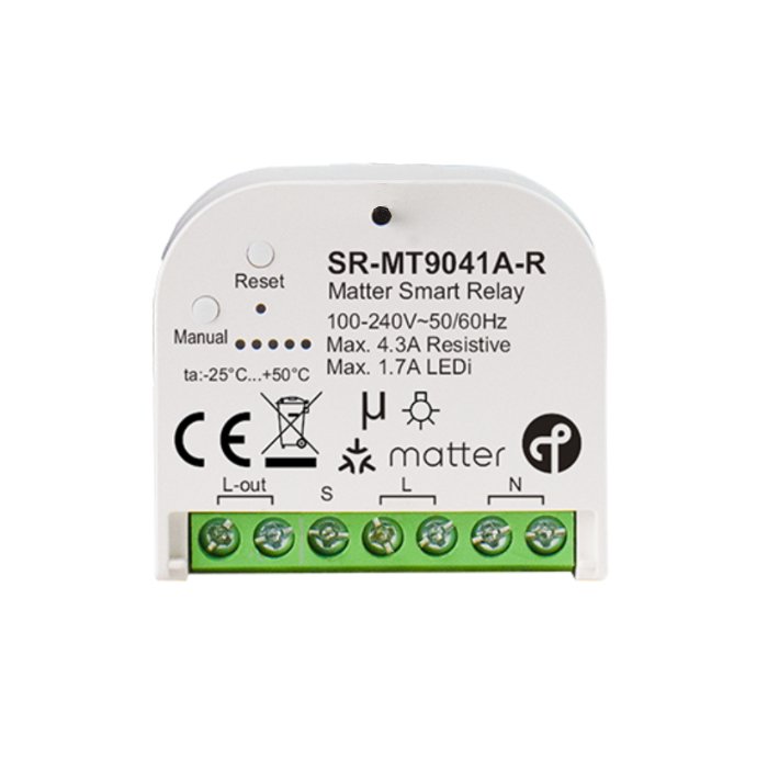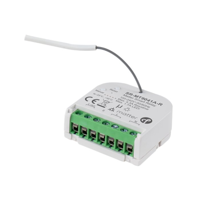 Matter spínač 230V s označením SR-MT9041A-R v kompaktním MINI provedení je elektronický produkt určený pro spínání osvětlení, LED žárovek a dalších elektronických zařízení. Umožňuje připojení běžně dostupných tlačítkových vypínačů pomocí PUSH-DIM sběrnice nebo integraci do systémů automatizace budov pomocí Matter či ZigBee (dual-tech) protokolu za účelem spínání zvoleného zařízení. Jeho výhodou je také jeho miniaturní velikost s možností montáže do podomítkové elektroinstalační krabičky KU68.
