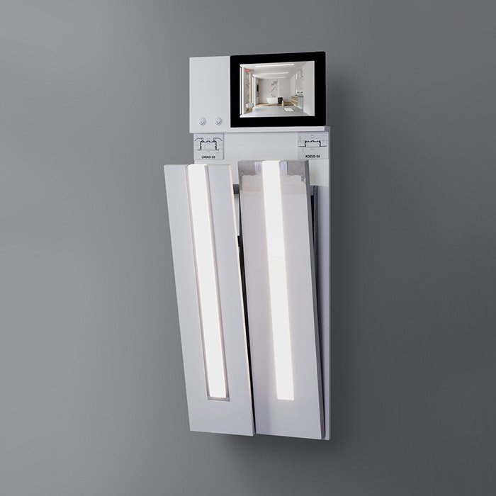- Rozsvícení produktů (v profilech jsou instalované LED pásky 3500K) + panel obsahuje veškerou potřebnou elektroniku.