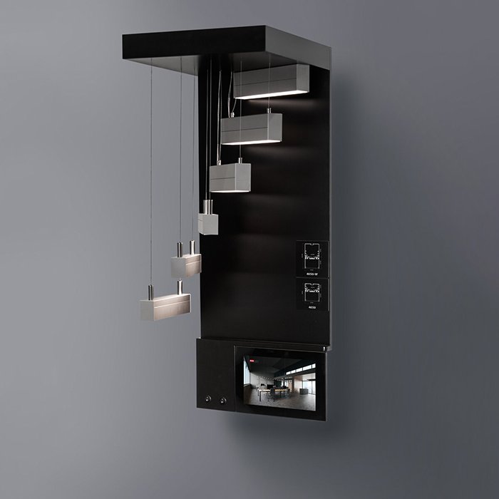 - Rozsvícení produktů (v profilech jsou instalované LED pásky 3500K) + panel obsahuje veškerou potřebnou elektroniku.