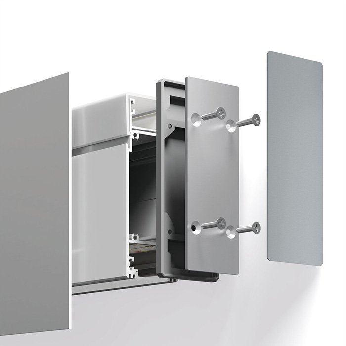 - Montáž koncovky formou vtlačení do profilu a dotažením utahovacích šroubů.