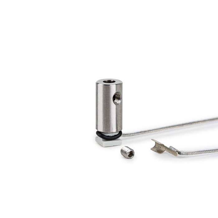 - připojení napájecího vodiče umožňuje vedení napětí skrze hlavici závěsného prvku na kovový prut nebo rameno až do svítidla k LED pásku.