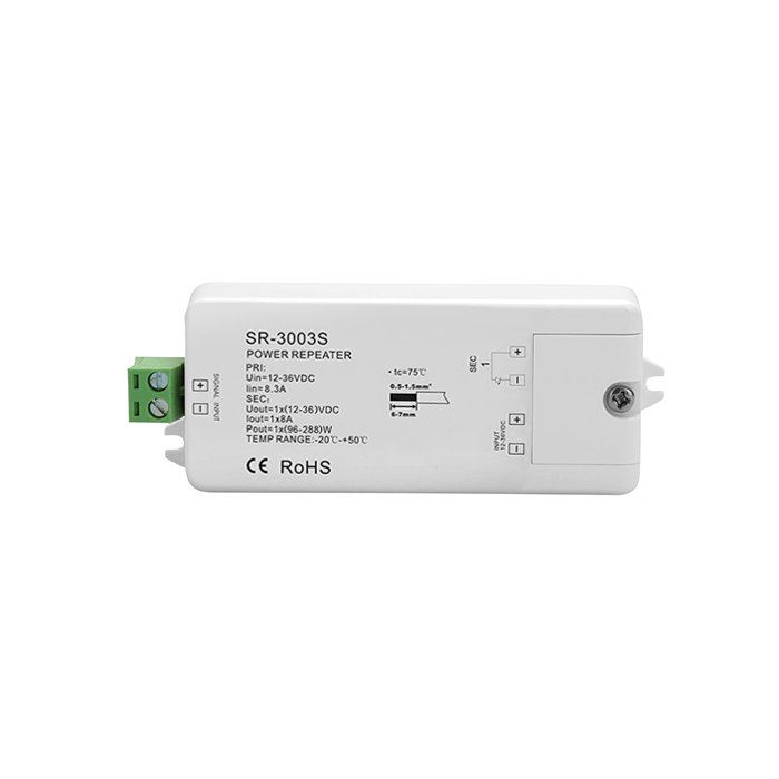 Zesilovač řídícího signálu stmívačů pro LED pásky s označením SR-3003S je důležitou elektronickou jednotkou zejména v rozsáhlých projektech osvětlení. Využívá se v situacích, kdy potřebujete ovládat větší příkon LED pásků, než umožňuje kapacita jednoho stmívače. Zesilovač LED signálu SR-3003S zajišťuje, že všechny připojené pásky reagují jednotně na řídící signál stmívače, ať už jde o změnu intenzity světla, barvy nebo zapnutí a vypnutí osvětlení.